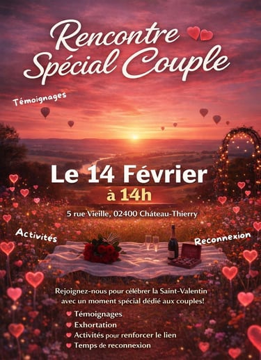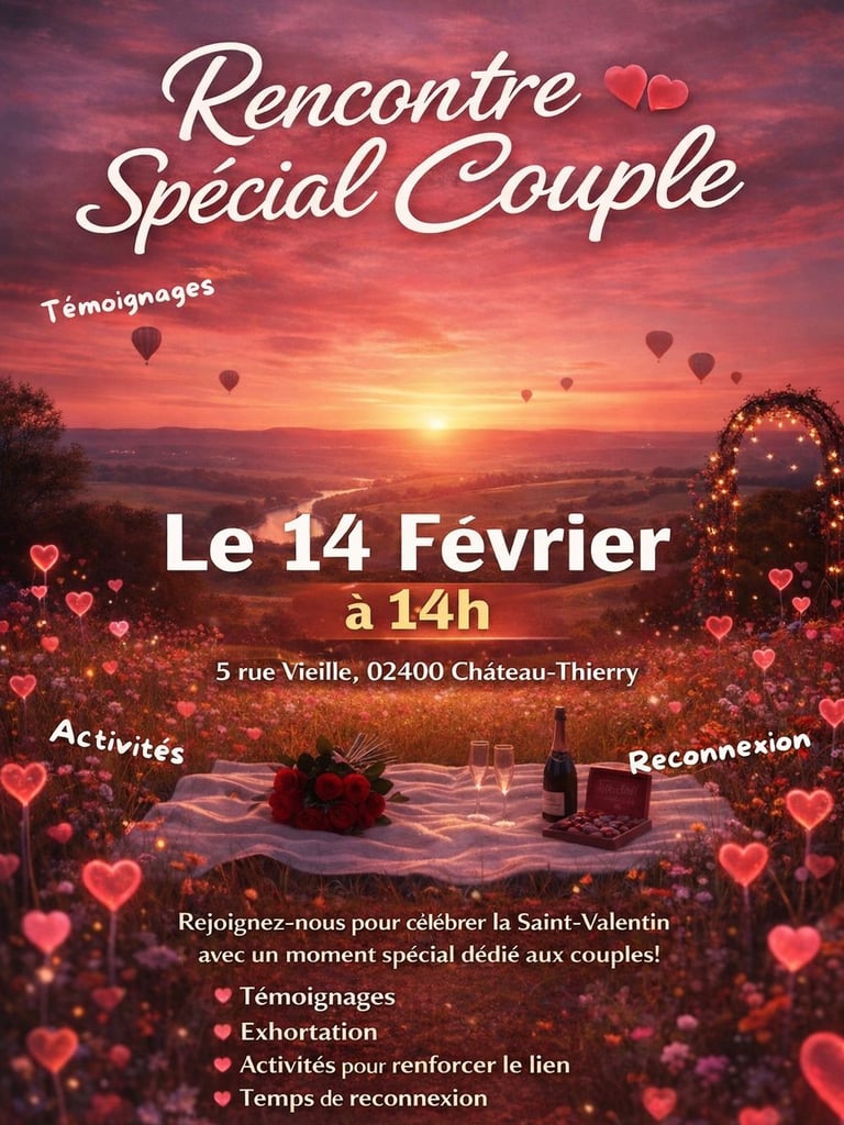 À l’occasion de la Saint-Valentin, notre église vous invite à une Rencontre Spécial Couple le 14 février à 14h, au 5 rue Vieille, 02400 Château-Thierry.